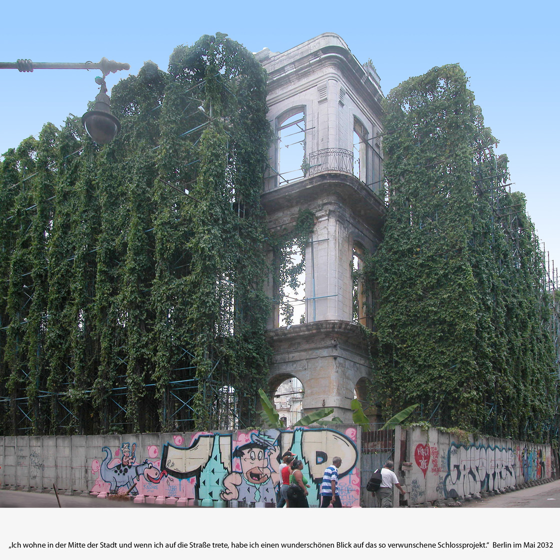 Ich wohne in der Mitte der Stadt und wenn ich auf die Straße trete, habe ich einen wunderschönen Blick auf das so verwunschene Schlossprojekt. Berlin im Mai 2032