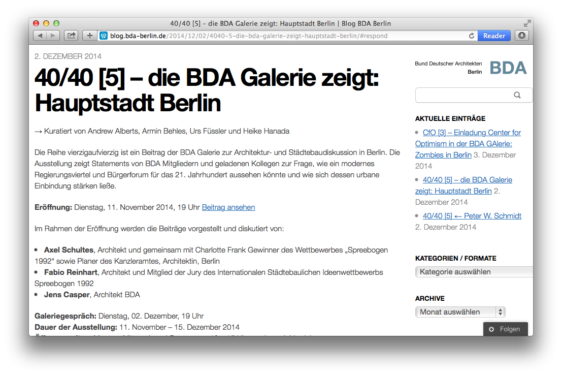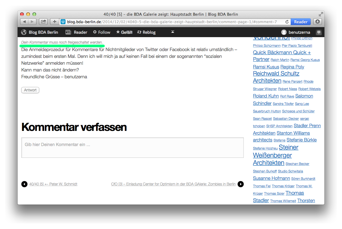 Im folgenden Beispiel wollen wir dem Beitrag „40/40 [5] – die BDA Galerie zeigt: Hauptstadt Berlin“ einen Kommentar anfügen.