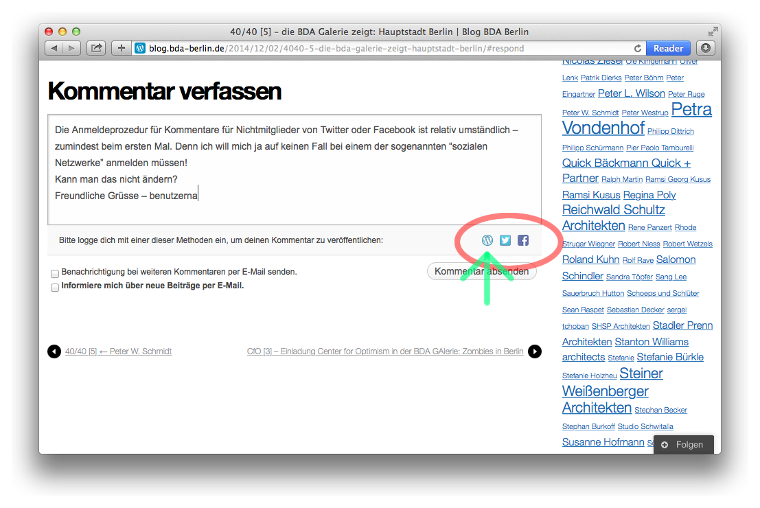 Wer einen oder mehrere unserer Beiträge des BDA-Blogs kommentieren möchte – kritisch, lobend, ergänzend – der steht, sofern er nicht bereits im Verfassen von Kommentaren auf den Internetseiten von Zeitungen oder anderer Blogs geübt ist, vor einer Hürde, die möglicherweise nicht ohne Hilfe zu überwinden ist.