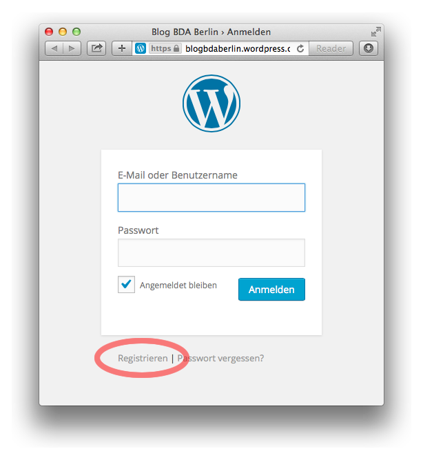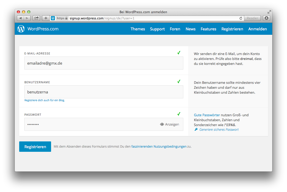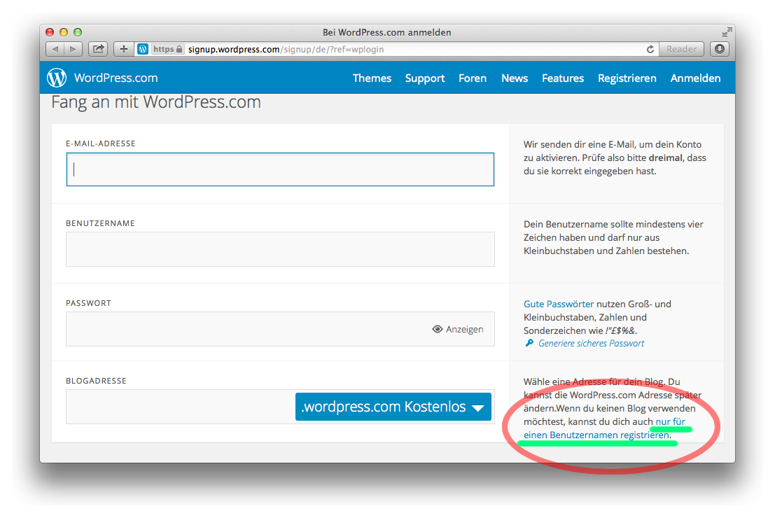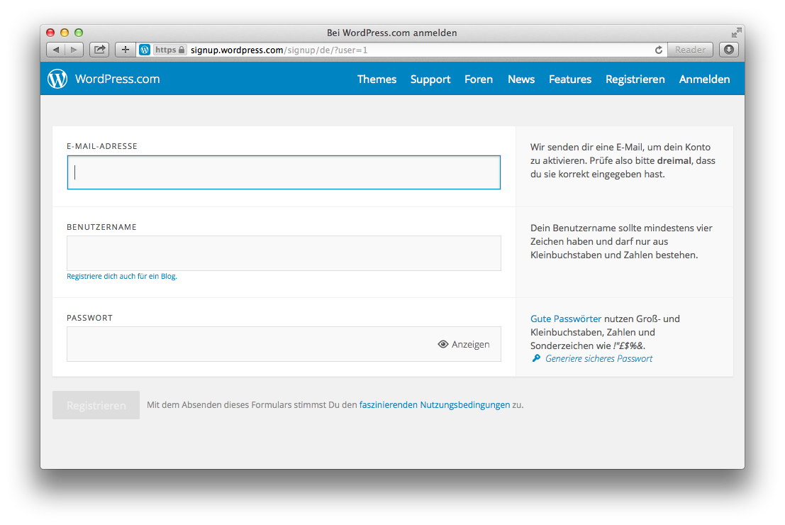 Um sich einen Zugang zu WordPress.com-Blogs einzurichten, müssen wir zwei Dinge angeben: