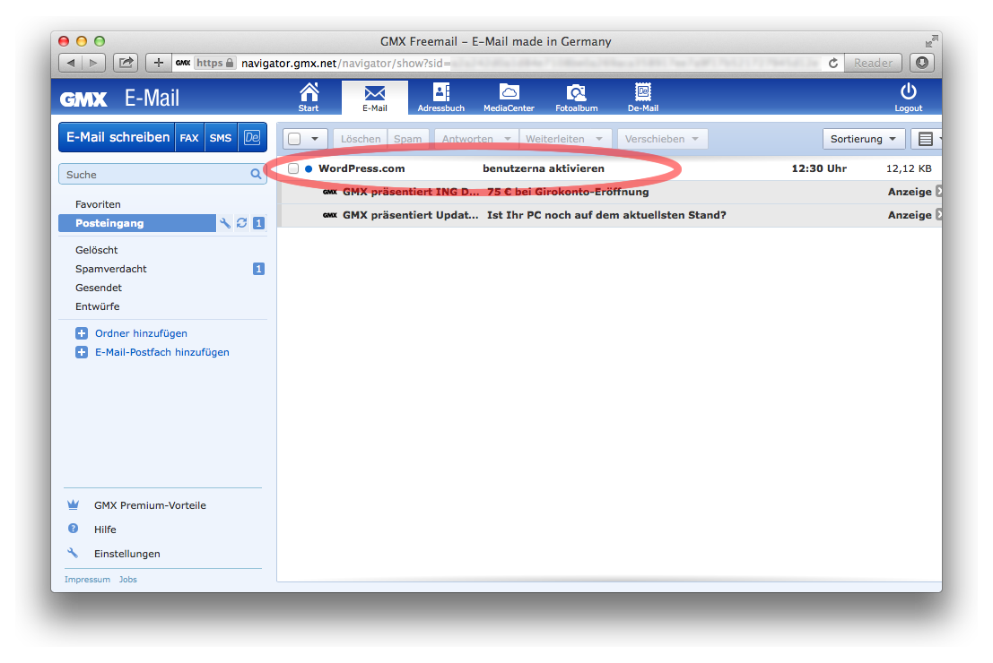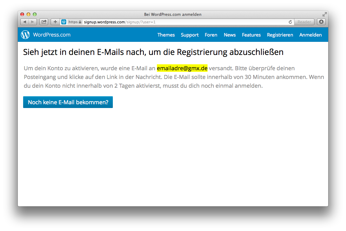 Wir schauen jetzt nach, ob wir eine Email von WordPress.com bekommen haben. Das Fenster könnte etwas so aussehen: