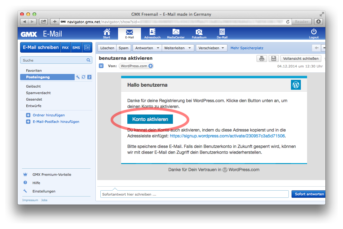 Die Email von WordPress.com hat den Titel „benutzername aktivieren“. Wir öffnen die Email:
