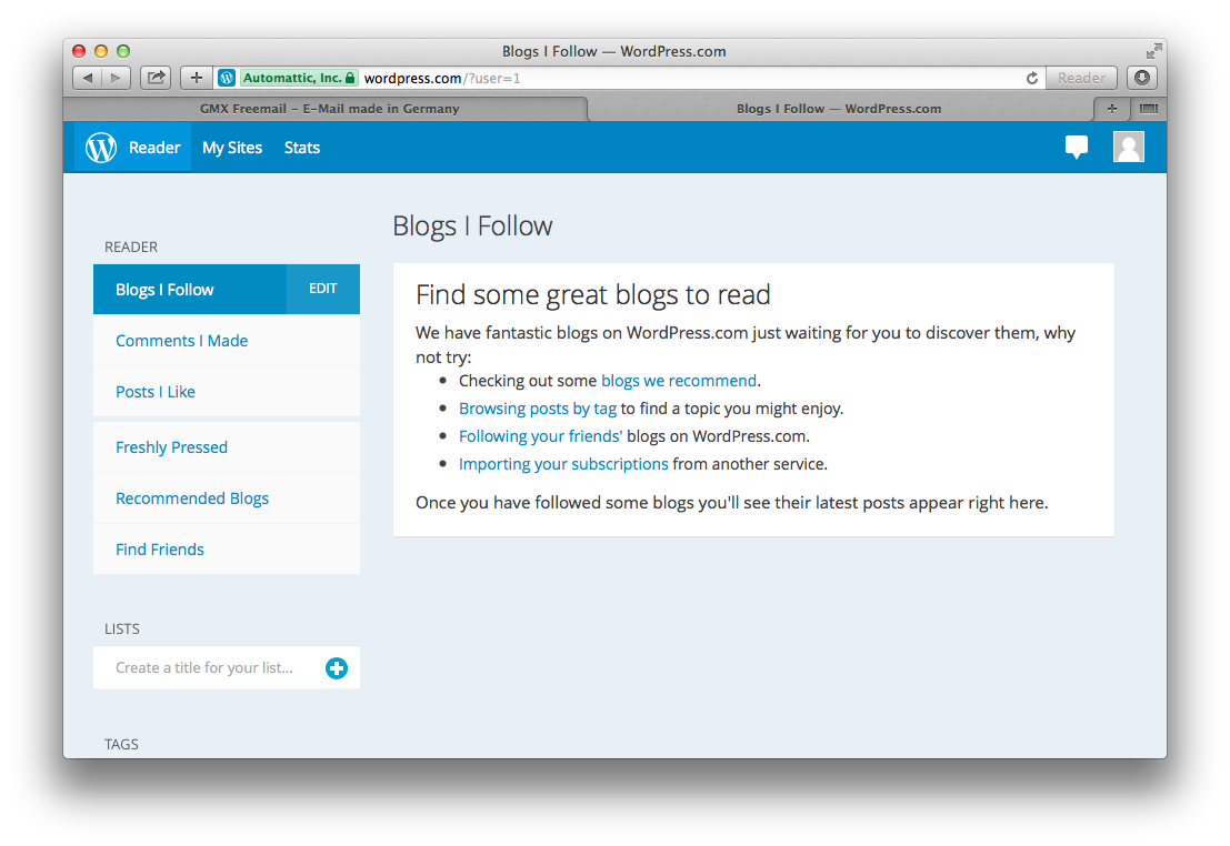 Falls wir aber kein Twitter- oder Facebook-Mitglied sind – und nichts läge hier ferner, als jemanden zu einer Mitgliedschaft bei einem dieser „sozialen Netzwerke“ überreden zu wollen – dann gibt es als dritte Möglichkeit den vergleichsweise bescheidenen Weg eines WordPress.com-Zugangs.