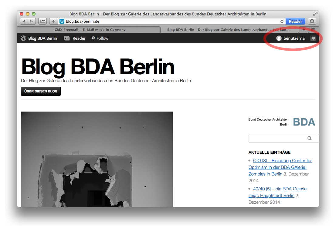 Jetzt gehen wir zurück zur Seite des Beitrags auf dem BDA-Blog, und melden uns (wenn wir das inzwischen nicht schon sind) bei WordPress.com mit dem besagten Benutzernamen und dem besagten Passwort an. Es erscheint am oberen Rand des Browserfensters ein schwarzer Balken, der anzeigt, dass wir angemeldet sind. Das sieht ungefähr so aus: