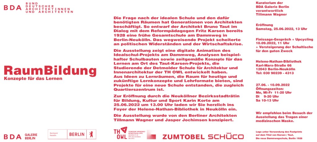 Die Ausstellung hat neben Analysen von beispielhaften Schulbauten eine digitale Rekonstruktion des paradigmatischen Schulbauprojekts der Dammwegschule des Pädagogen Fritz Karsen mit dem Architekten Bruno Taut von 1928 sowie 8 konzeptionelle Entwurfspositionen für einen Schulneubau auf diesem Gelände, die von Studierenden der Detmolder Schule für Architektur und Innenarchitektur der TH OWL entworfen wurden, zum Inhalt. Die Ausstellung wird von Tillmann Wagner und Jasper Jochimsen für die BDA Galerie Berlin kuratiert.