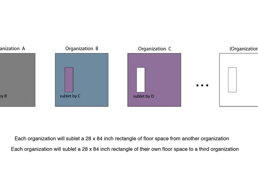 Die Arbeit Untitled (Sublet (2)) installiert einen Raum im Raum der BDA Galerie: Eine Fläche von 28″ x 84″ (ca. 70 cm x 210 cm) wird an eine andere Institution vermietet. Gleichzeitig mietet die BDA Galerie selbst eine Fläche von gleicher Größe in einer weiteren Institution an. Die Arbeit besteht in diesen Rechtsvorgängen und dem resultierenden Rechtsverhältnis.